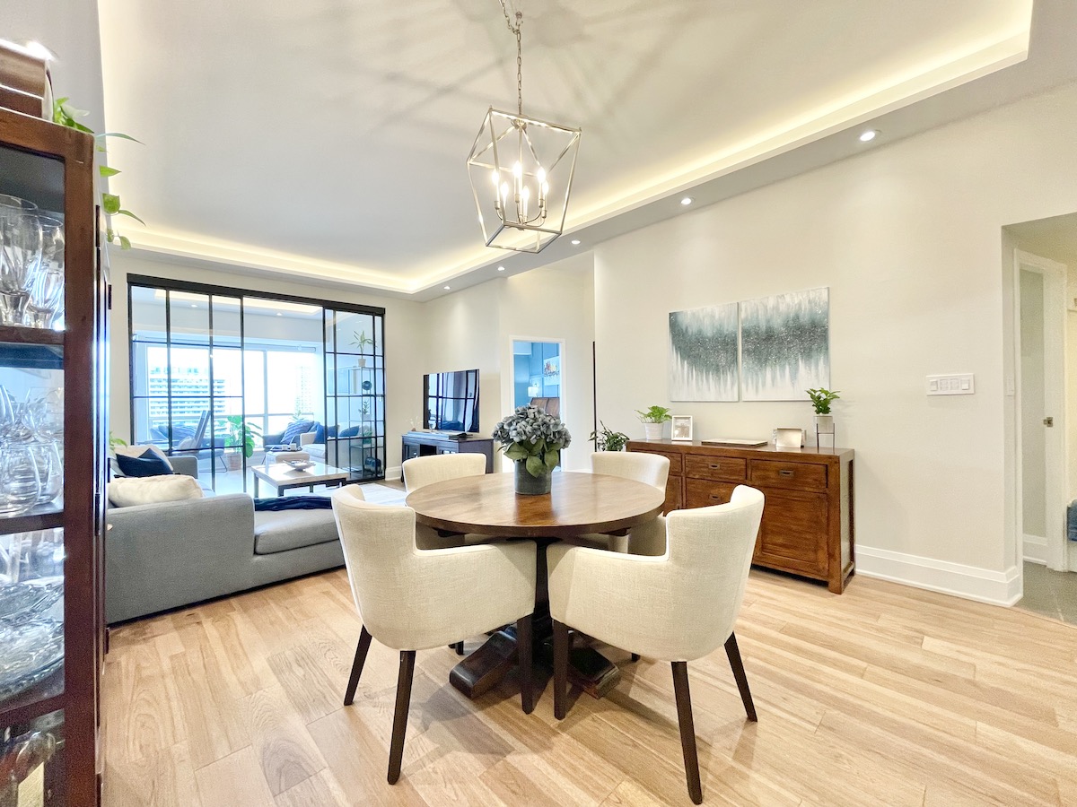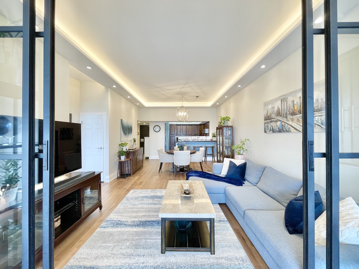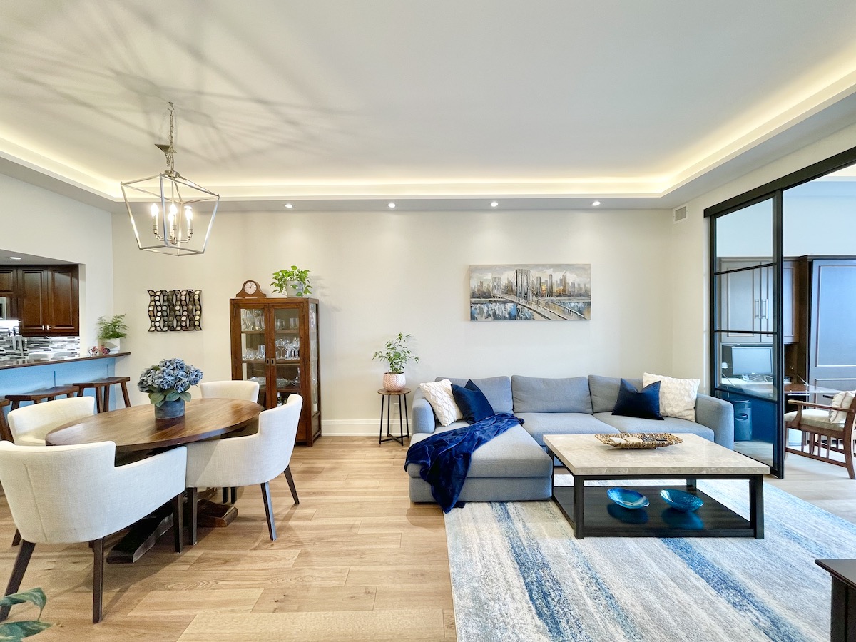 Every inch of this 1,225 square foot condo is draped in high-quality finishes. Wide-planked, engineered hardwood floors provide a seamless connection between rooms. The open-concept living area is illuminated with a fully-integrated lighting system that can be controlled through an app. 10-foot ceilings are tastefully punctuated by coves, creating soft indirect lighting that caters to any mood. Meanwhile, prepare meals and entertain guests in your upgraded kitchen overlooking the dining/buffet area. A breakfast bar anchors the space, surrounded by stainless steel appliances, solid wood cabinetry and luxurious countertops.