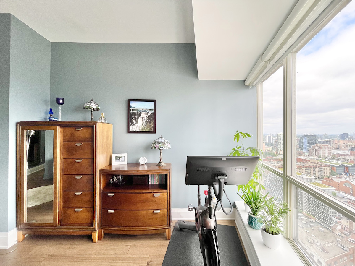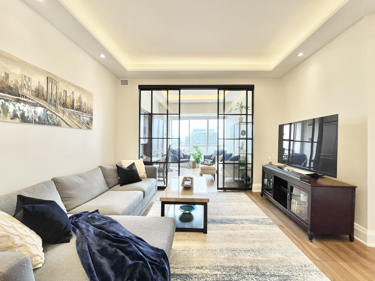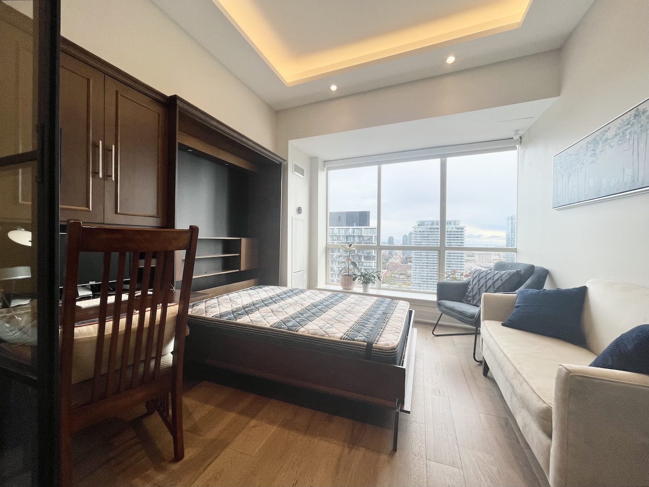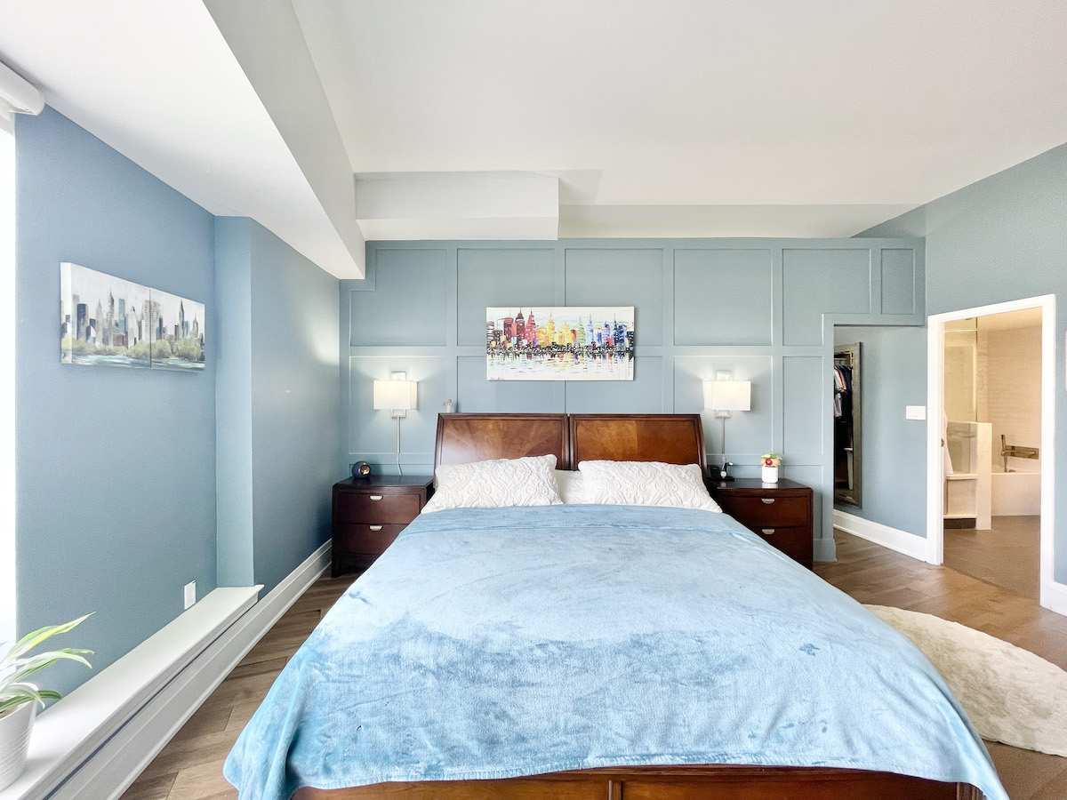 Step deeper into the suite to unveil the gorgeous room behind double-glass sliding doors. This room includes a built-in Murphy bed, accompanied by a pull-out desk. As if that’s not enough, the space is flooded with natural light and framed by picturesque easterly views.