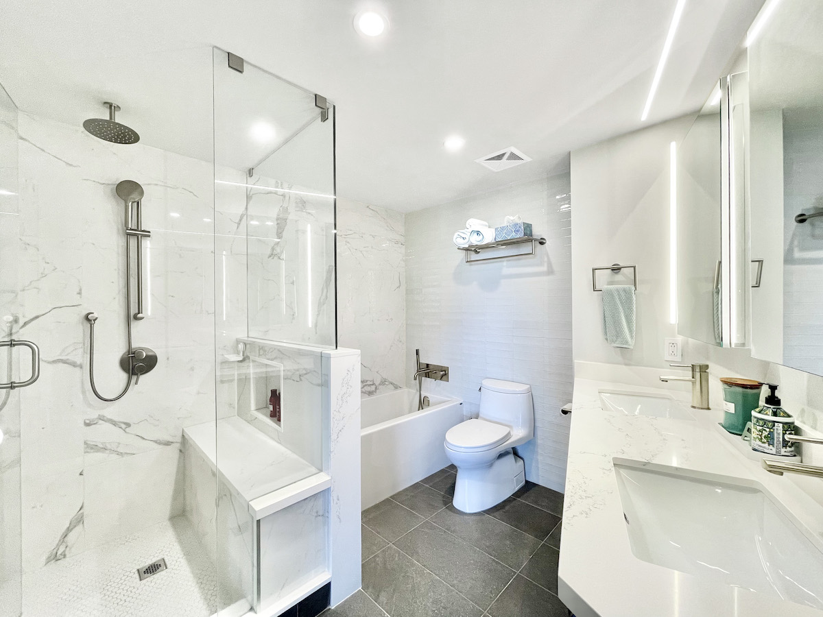 The master bedroom is a show-stopper with high ceilings, wainscot panels, and wall-to-wall windows. Wake up to beautiful views in your king-sized bed, which easily fits in this generous space. Meanwhile, getting ready is a breeze. The master bath showcases a spa-inspired shower and tub, floor-to-ceiling tiles, and its own integrated lighting system. Just outside is a large walk-in closet — complete with custom shelving, an island, plus another interior closet within. In addition, this unit comes with a 135-cubic-foot locker!