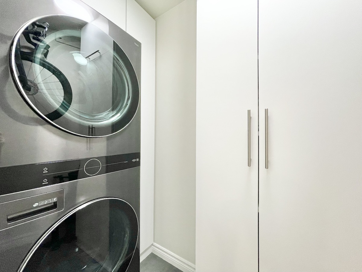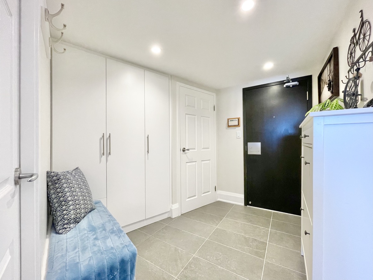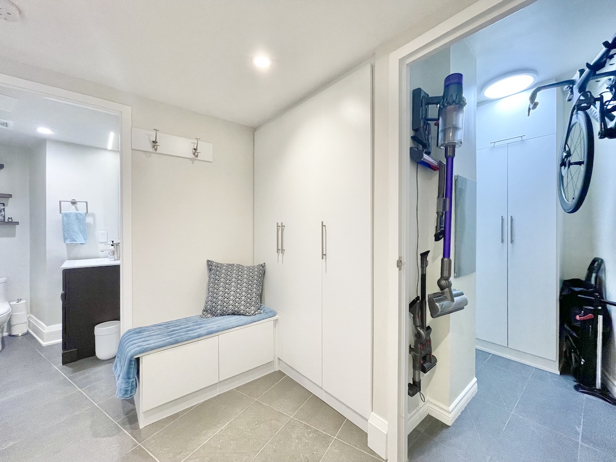 Step inside and you’re greeted by a spacious foyer, featuring a seating area and custom built-in closets. Just to the corner is a mud room/laundry — complete with a new washer & dryer set, plus a bike rack, and plenty of storage that effortlessly meets your practical needs.