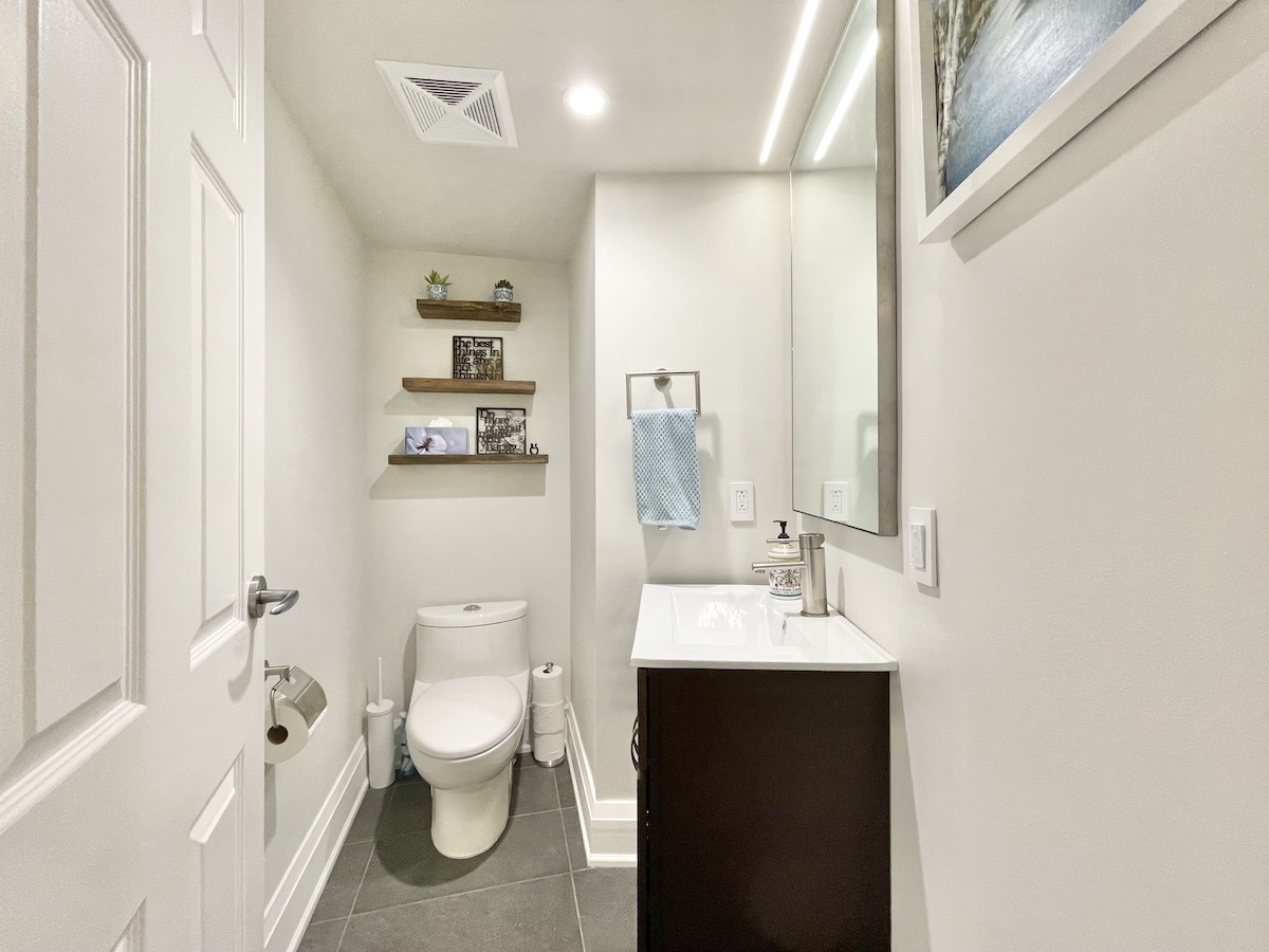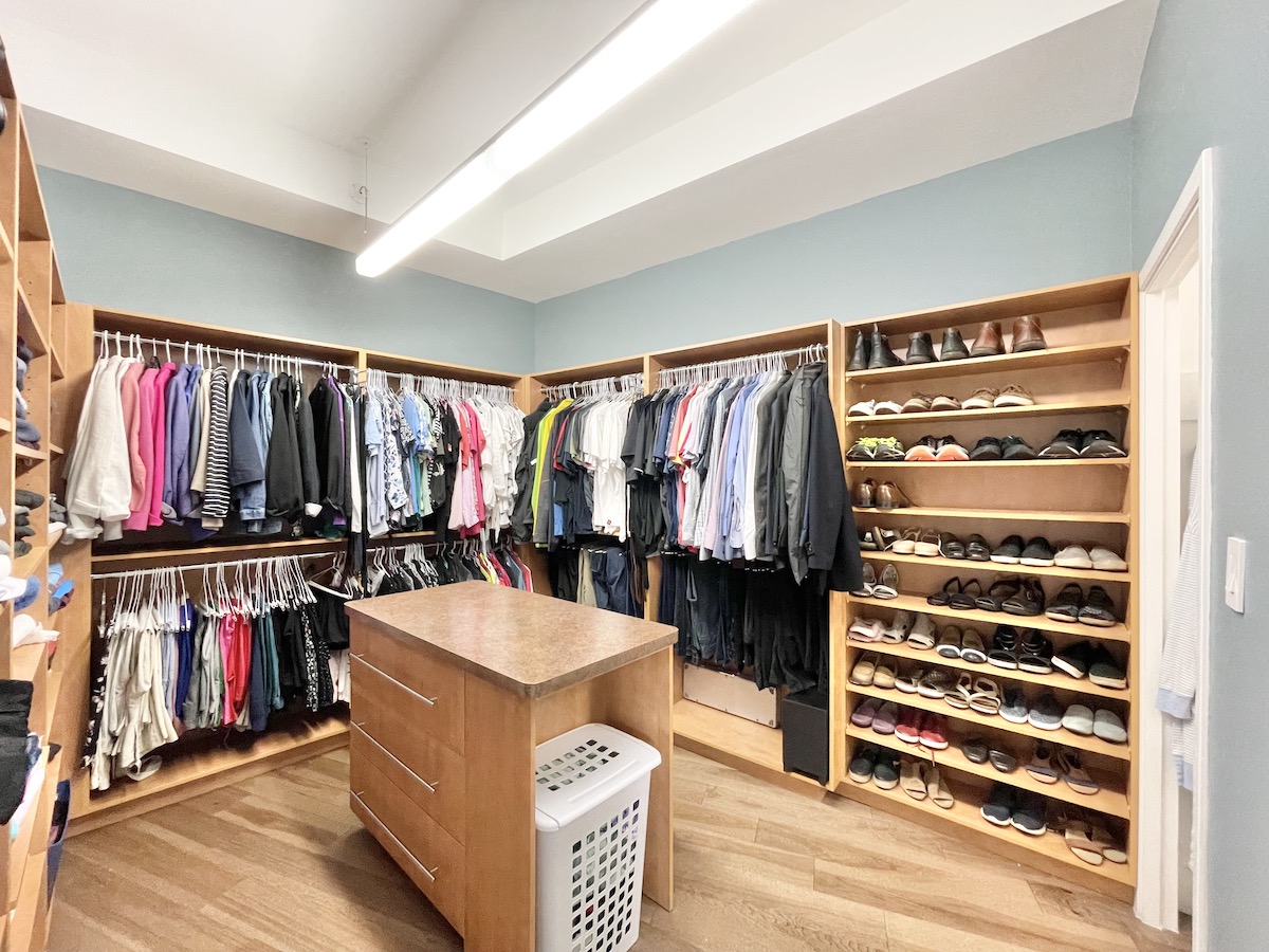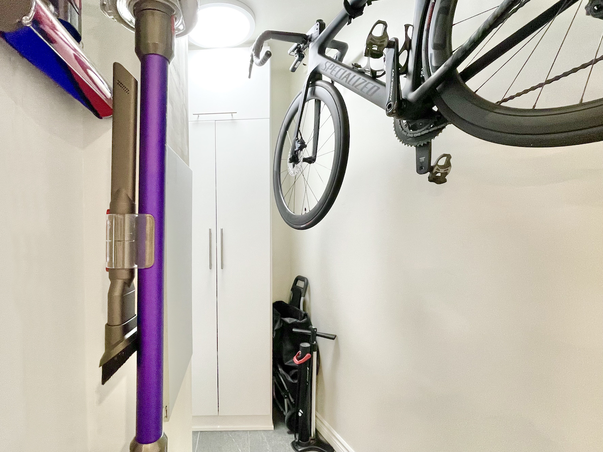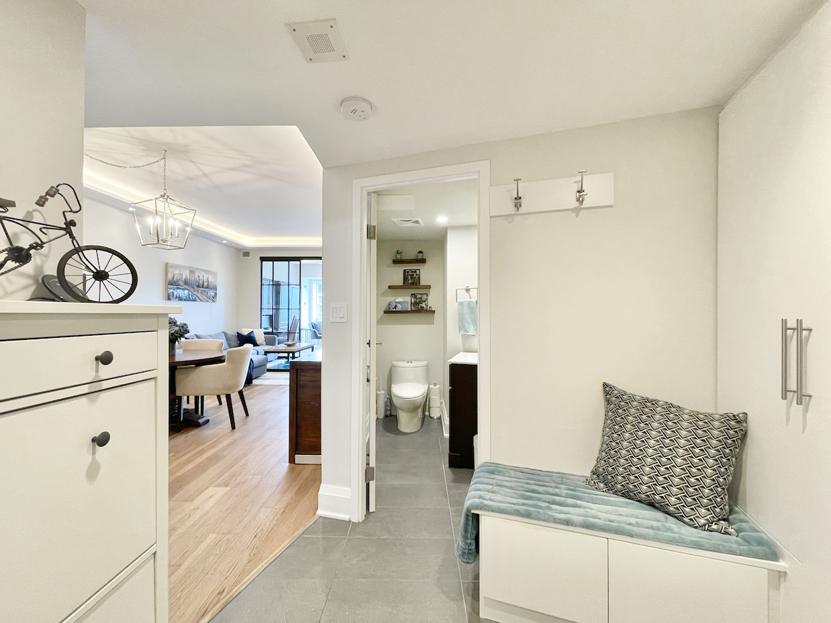 Step inside and you’re greeted by a spacious foyer, featuring a seating area and custom built-in closets. Just to the corner is a mud room/laundry — complete with a new washer & dryer set, plus a bike rack, and plenty of storage that effortlessly meets your practical needs.